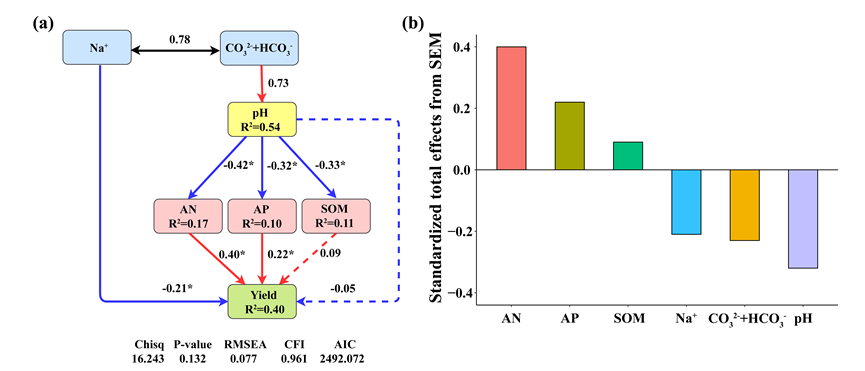 近期,東北地理所科研人員利用吉林大安農(nóng)田生態(tài)系統(tǒng)國(guó)家野外科學(xué)觀測(cè)研究站內(nèi)隨機(jī)采集的不同鹽堿程度稻田水稻植株和土壤樣品,進(jìn)行科學(xué)分析檢測(cè),通過(guò)層次分割和結(jié)構(gòu)方程模型定量評(píng)估了土壤不同化學(xué)指標(biāo)對(duì)水稻產(chǎn)量的獨(dú)立和綜合影響。結(jié)果表明,土壤pH、[CO32?+HCO3?]和堿解氮(AN)是限制蘇打鹽堿地水稻產(chǎn)量最重要的土壤鹽堿參數(shù)、鹽分離子和養(yǎng)分指標(biāo)。在這些因子中,高濃度的CO32?和HCO3?導(dǎo)致了土壤高pH,土壤高pH是限制蘇打鹽堿地水稻產(chǎn)量的關(guān)鍵,而提高土壤AN含量具有抑制pH和碳酸鹽毒害,提升水稻產(chǎn)量的重要作用。尤其在重度鹽堿土(9 ≤ pH < 10)上,提升土壤AN含量,水稻會(huì)表現(xiàn)出更高的增產(chǎn)潛力。因此,降低土壤[CO32?+HCO3?]導(dǎo)致的高pH環(huán)境的同時(shí),提升土壤氮水平是提高鹽堿地水稻產(chǎn)量的關(guān)鍵。