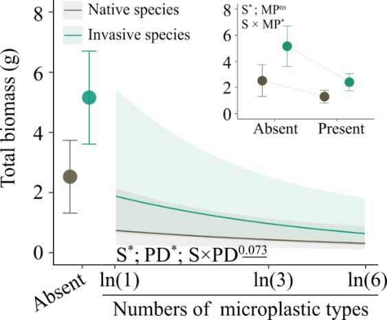 圖2?微塑料不同多樣性水平下外來入侵植物與本地植物的總生物量