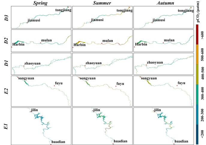 中國科學院東北地理與農(nóng)業(yè)生態(tài)研究所水環(huán)境遙感學科組科研人員以松花江為研究對象,率先建立了河流表層水體CO2分壓(pCO2)遙感反演算法,利用哨兵二號時間序列衛(wèi)星影像實現(xiàn)了松花江表層水體pCO2 10m分辨率的逐年高精度制圖,并估算了松花江水-氣界面CO2排放通量。研究結果表明2016-2022年松花江表層水體pCO2年際變化較小,多年均值為395 μatm;通過分析2022年pCO2的逐月反演結果,發(fā)現(xiàn)在時間尺度上松花江表層水體pCO2有顯著的季節(jié)變化特征:夏季(445±125μatm)>秋季(373±58μatm)>春季(351±57μatm)(圖1);2016-2022年間松花江水-氣界面年均CO2最低排放速率為-4.43±5.76 mmol/m2/d,最高可達8.26±26.92 mmol/m2/d,除2017年松花江為大氣碳源外,其余年份皆為大氣的弱碳匯。本研究為應對氣候變化和評價水體在大氣溫室氣體源匯格局中的作用提供了重要的科學依據(jù)。