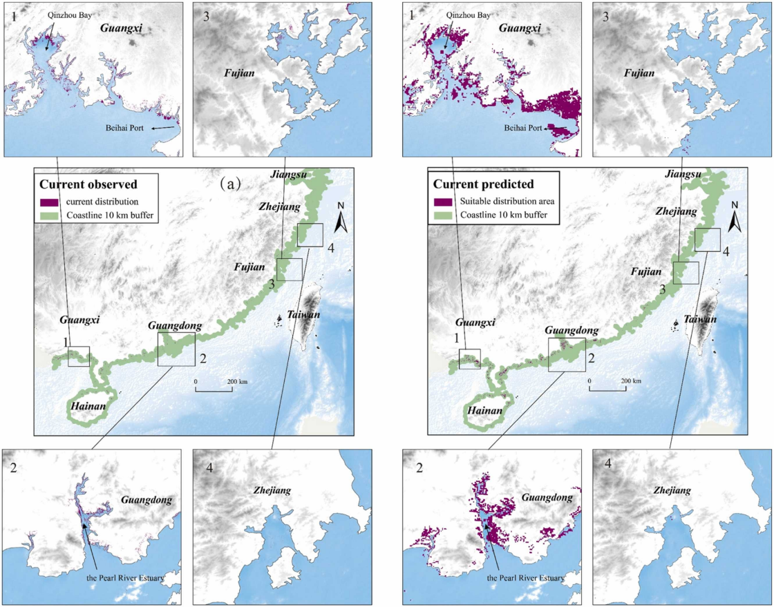 紅樹林濕地是地球上生產(chǎn)力最高的區(qū)域之一,是重要的“碳匯”。然而,由于氣候變化和人類活動(dòng)的影響,我國(guó)紅樹林面積大幅度減少,且被開墾為沿海農(nóng)田和水產(chǎn)養(yǎng)殖池。目前,我國(guó)紅樹林面積總體上呈現(xiàn)先減少后增加的特點(diǎn),且面臨的威脅已由早期的毀林破壞轉(zhuǎn)變?yōu)橐蛉藶楹妥匀灰蛩毓餐饔脤?dǎo)致的生態(tài)退化。因此,研究氣候變化對(duì)紅樹林潛在分布和碳匯的影響對(duì)于其保護(hù)和恢復(fù)至關(guān)重要。本研究基于15種主要紅樹林物種,構(gòu)建了高精度的物種分布模型,模擬了當(dāng)前時(shí)期(1981-2010年)中國(guó)紅樹林的潛在分布,并預(yù)測(cè)了21世紀(jì)末(2071-2100年)三種氣候情景(SSP1-2.6、SSP3-7.0和SSP5-8.5)下的潛在分布。