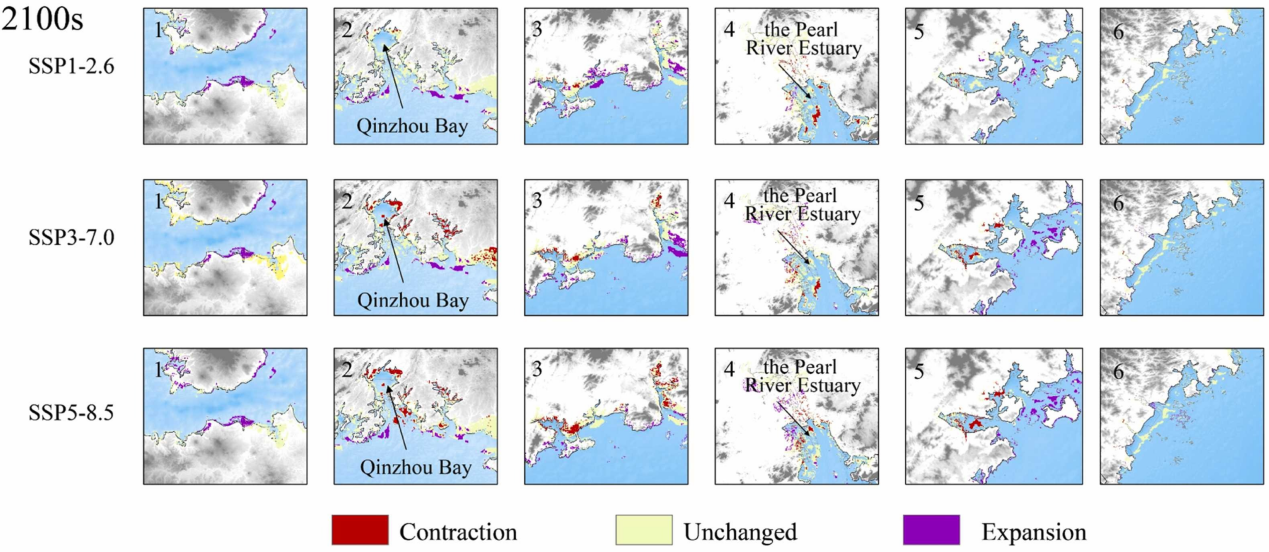 結(jié)果表明:1)影響中國(guó)紅樹林適宜性的四個(gè)關(guān)鍵因素是:最冷季節(jié)的氣溫、海表溫度范圍、等溫性和年降水量;2)在21世紀(jì)末,紅樹林將向北擴(kuò)展2至2.5個(gè)緯度,但互花米草的潛在分布也將迅速擴(kuò)大,對(duì)本土紅樹林物種構(gòu)成競(jìng)爭(zhēng)威脅;3)通過(guò)將潛在紅樹林分布區(qū)的沿海農(nóng)田和養(yǎng)殖池塘設(shè)為恢復(fù)區(qū),紅樹林碳庫(kù)將比當(dāng)前增加178.22%至296.44%,藍(lán)碳將比當(dāng)前增加242.64%至262.70%。本研究可以為中國(guó)未來(lái)紅樹林的保護(hù)和恢復(fù)工程,就目標(biāo)地點(diǎn)、目標(biāo)物種和碳匯效益提供寶貴的信息。
