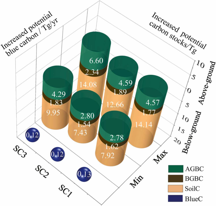 圖3. 三種紅樹林恢復(fù)情景下潛在碳庫(kù)存和藍(lán)碳的增加。(AGBC指地上生物量碳,BGBC指地下生物量碳,SoilC指土壤碳,BlueC指藍(lán)碳)。