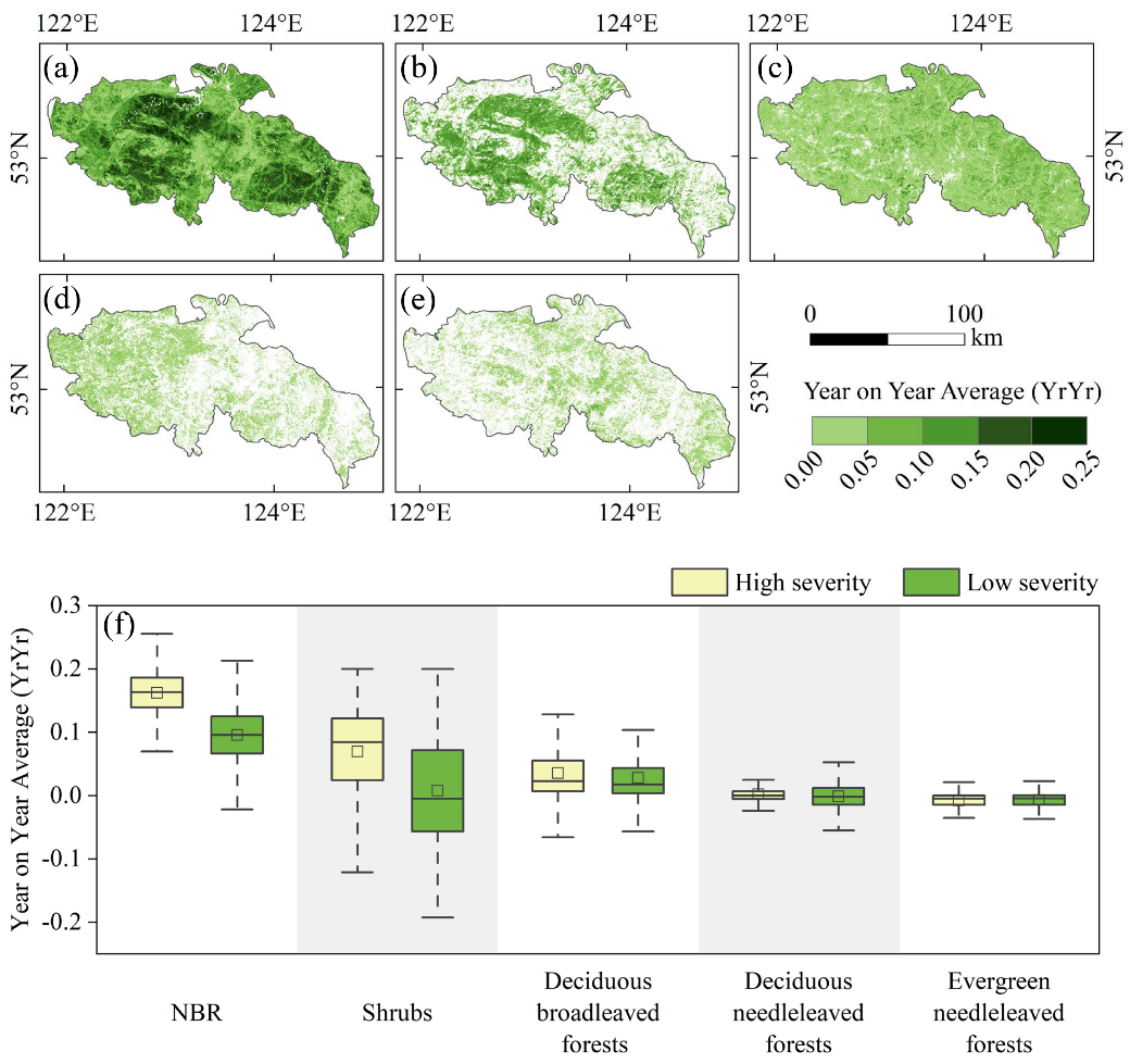 圖1. NBR指數(shù)(a)、灌木覆蓋率(b)、落葉闊葉林覆蓋率(c)、落葉針葉林覆蓋率(d)和常綠針葉林覆蓋率(e)的YrYr短期恢復(fù)指標空間模式及不同燃燒強度區(qū)域的對應(yīng)YrYr統(tǒng)計(f)