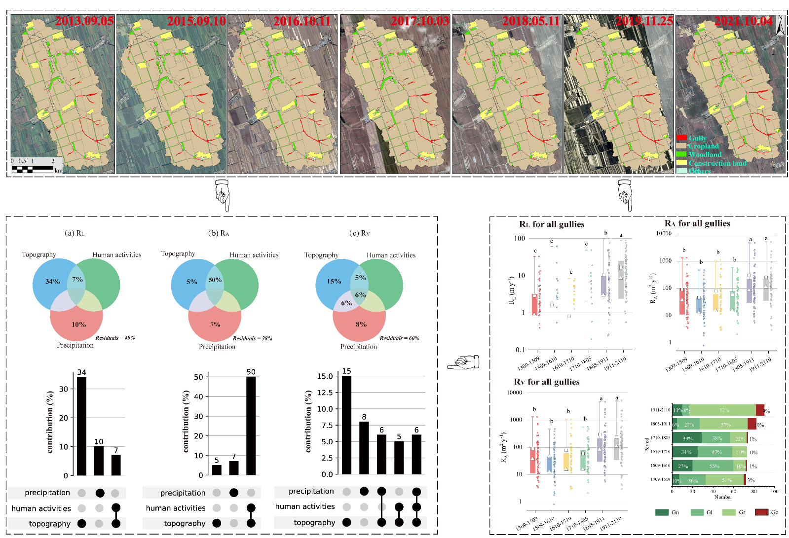 為此,東北地理所黑土退化與修復學科組在典型黑土區海倫市選擇了典型農業小流域進行侵蝕溝發育過程遙感監測和野外原位監測。通過建立耕作壟向指數(TEI)、線性地物效應指數(LEI)及林、路-溝距離指數(DL)來量化耕作壟向與道路、林帶對侵蝕溝發育的影響(圖1),研究結果表明,2013~2021年小流域尺度溝頭溯源速率、溝道擴張速率、溝蝕土壤流失速率分別為5.7 m/yr、137.4 m2/yr和428.5 m3/yr,與累計降水量、降雨侵蝕力、最大30min雨強、降雨時長均呈顯著正相關關系;溝頭坡度、溝道匯水面積、溝頭匯水面積分別是控制溝頭溯源、溝道擴張和溝蝕土壤流失的主要地形因素;平水年橫坡壟作可顯著遏制溝頭溯源,但在連續豐水年則促進切溝形成和加劇溝頭溯源,壟向與溝岸夾角在30°~90°時溝岸擴張最為劇烈,道路和林帶越密集、與等高線夾角越大,侵蝕溝發育速率越大,溝蝕速率與TEI、LEI、DL呈顯著遞增的冪函數和指數函數關系;地形、地形&人為活動、氣候&地形&人為活動分別對溝頭溯源速率、溝道擴張速率、溝蝕土壤流失速率變化的貢獻最大,分別為34%、50%、40%(圖2)。本研究結果可為從優化小流域耕作壟向與道路林帶建設布局的角度防治溝道侵蝕提供科學參考。