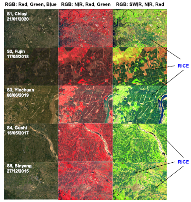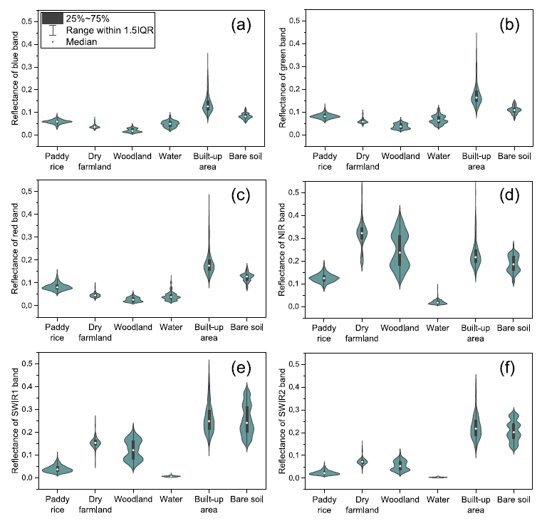針對以上科學(xué)難題,中國科學(xué)院東北地理所李華朋副研究員帶領(lǐng)團(tuán)隊(duì),首次研發(fā)了一種全新的方法,命名為RiceTColour,旨在基于水稻在移栽期間的獨(dú)特光譜特征開展水稻遙感制圖。通過分析水稻和其他土地覆蓋在可見光、近紅外和短波紅外波段的光譜分布特征,首次發(fā)現(xiàn)水稻在移栽期近紅外和短波紅外反射率值低于其他地物類型(除水體)的獨(dú)特特征;進(jìn)而,使用短波紅外、近紅外和紅色波段組合,水稻田在遙感影像上呈現(xiàn)獨(dú)特的顏色。