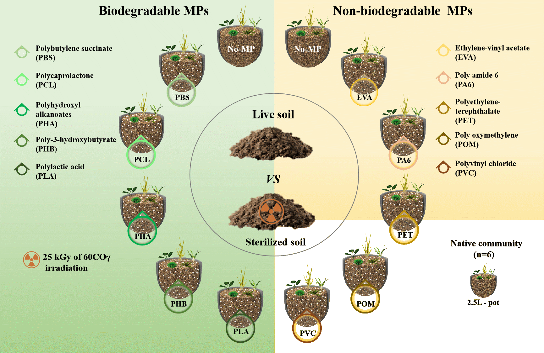 基于以上研究空白,中國(guó)科學(xué)院東北地理與農(nóng)業(yè)生態(tài)研究所生物入侵生態(tài)學(xué)研究團(tuán)隊(duì)設(shè)計(jì)了一個(gè)包含多種微塑料、多個(gè)本地植物群落的溫室盆栽實(shí)驗(yàn)(圖1)。實(shí)驗(yàn)設(shè)計(jì)如圖1所示:對(duì)由5種草地植物組成的本地群落分別進(jìn)行 11 微塑料(5可降解微塑料,5不可生物降解微塑料,1對(duì)照)和土壤滅菌(滅菌vs.不滅菌)的全因子處理。