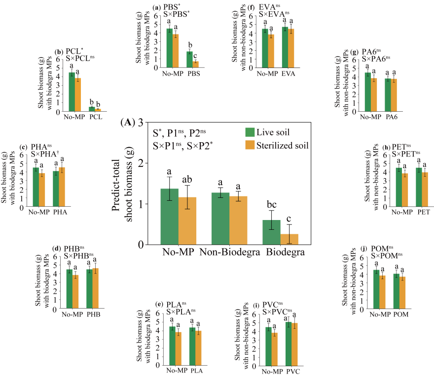 基于以上,我們的多物種實(shí)驗(yàn)表明,雖然可生物降解微塑料通常被認(rèn)為更具環(huán)境友好性,但它們對(duì)植物群落生長(zhǎng)和多樣性的危害并不一定低于不可生物降解微塑料。某些生物可降解微塑料,如PBS,仍然會(huì)對(duì)植物群落結(jié)構(gòu)和生產(chǎn)力造成重大生態(tài)風(fēng)險(xiǎn)。同時(shí),研究結(jié)果也表明土壤中存在的生物群能夠緩解某些可生物降解微塑料對(duì)植物群落的不利影響。