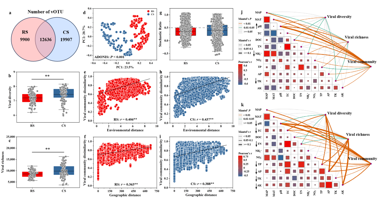 為此,東北地理所農田分子生態(tài)學科組研究人員大范圍采集了典型黑土帶的水稻土和毗鄰的玉米地土壤,利用宏基因組測序技術,解析了水田(RS)和旱作土壤(CS)病毒群落地理分布格局及病毒攜帶ARGs的傳播機制和生態(tài)策略。