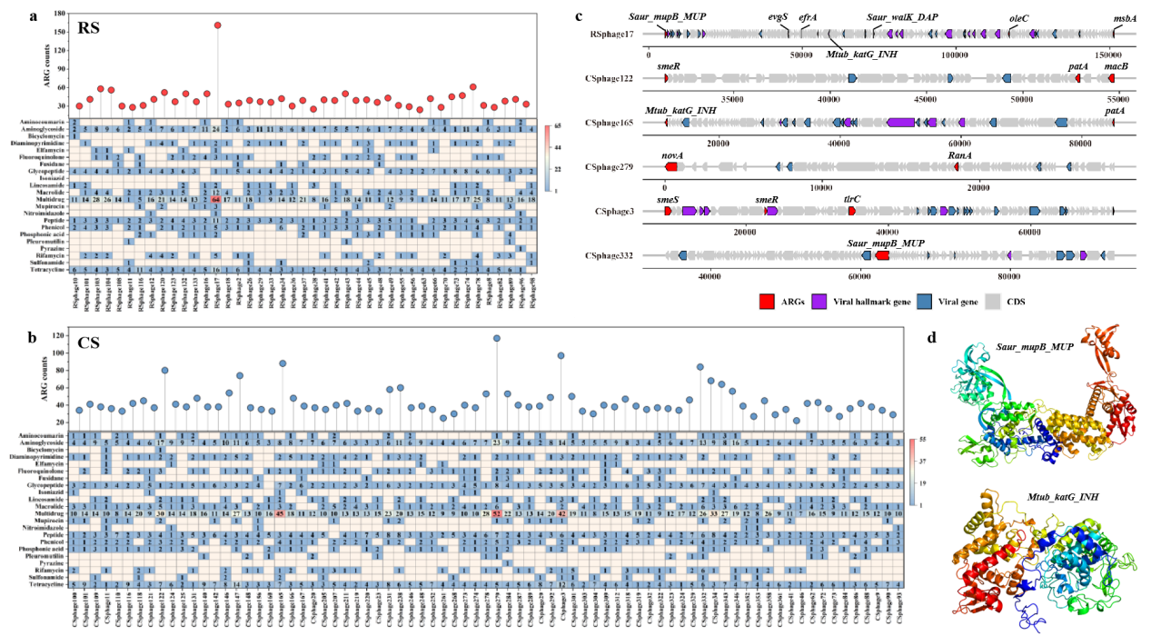 研究表明,東北黑土帶土壤病毒群落存在顯著距離衰減模式。與RS相比,CS中的病毒群落具有更高的群落多樣性和差異顯著的群落結構,但RS和CS中的病毒群落并不具有維度多樣性梯度格局(圖1)。土壤pH是決定病毒群落分布的主要因素,而較高的土壤養(yǎng)分含量顯著降低病毒群落多樣性。Uroviricota、Nucleocytoviricota和Artverviricota是農田土壤中的主要病毒門,同時發(fā)現(xiàn)病毒群落的宿主涉及包括放線菌、變形菌等在內的17個原核微生物門。此外,我們在RS和CS中檢測出了27類抗生素抗性類型,其中多重耐藥型在黑土中的占比最高。結合病毒群落數(shù)據發(fā)現(xiàn),RS和CS中攜帶ARGs的病毒數(shù)分別占總群落的9.61%和11.4%。進一步拼接構建環(huán)狀噬菌體基因組發(fā)現(xiàn),RS中的溶原噬菌體攜帶了29.7%的ARGs,明顯高于CS中的12.5%,而CS中攜帶ARGs的病毒主要為烈性噬菌體(圖2)。本研究揭示了黑土帶區(qū)域尺度上的兩類農田土壤中病毒和抗生素抗性基因的分布特征及病毒攜帶ARG的裂解溶原策略。