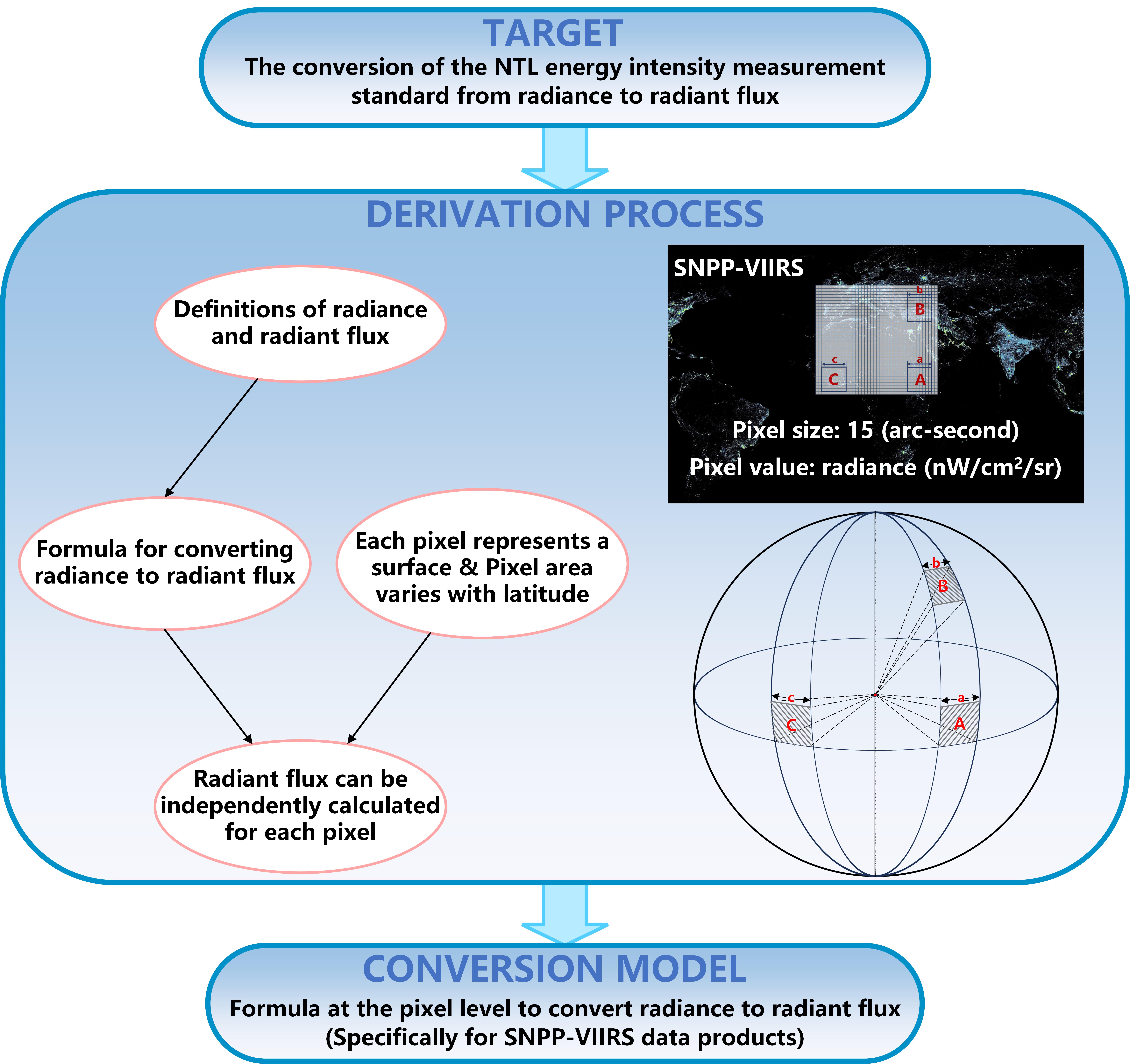 夜光遙感是估算社會經濟參數、評估城市發展以及研究光污染對生態環境影響的重要手段。然而,如何準確地反映夜間燈光能量強弱目前仍然是一個挑戰。當前應用最為廣泛的夜光遙感數據為SNPP-VIIRS數據,其空間分辨率為15角秒(赤道處約500m),采用輻亮度(單位:nW/cm2/sr)來描繪夜間燈光輻射能量強弱。輻亮度代表單位投影面積、單位立體角、單位時間內面輻射源輻射的能量,本質上講反映的是能量密度在某一方向上的特征而非能量本身。因此,當影像像元面積相同時,輻亮度可以反映夜光像元間的相對能量強弱,但是當像元面積不同時,使用建立在單位面積基礎上的物理量來反映能量強弱,將會帶來嚴重系統誤差。而使用SNPP-VIIRS數據的大部分研究都面臨這一問題,其像元面積隨緯度而變化,直接使用輻亮度來反映其能量強弱顯然不夠準確。本研究提出將輻亮度轉換為輻射通量(某一表面單位時間輻射出的能量,單位:W),以達到更準確、直觀地描繪夜間燈光的目的(圖1)。