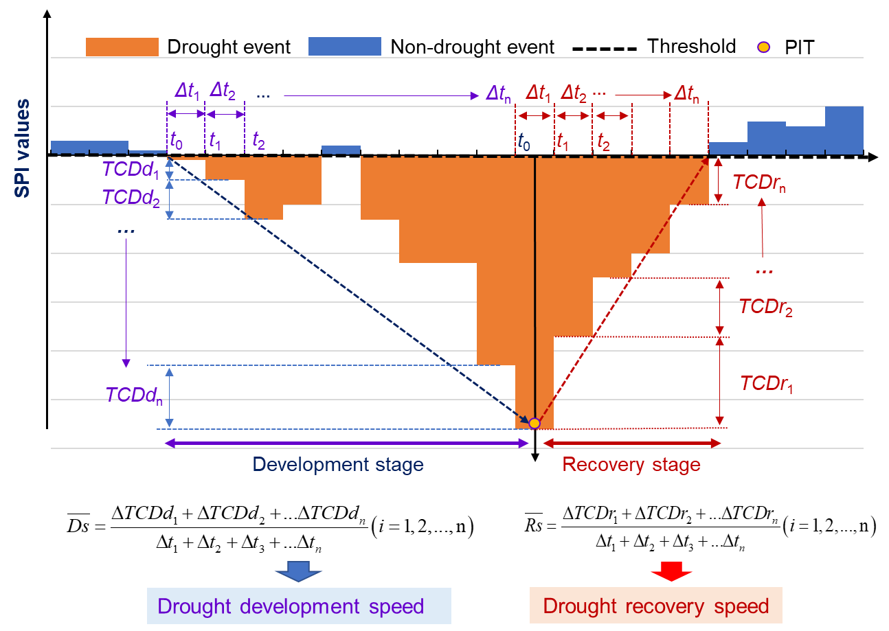 氣候變化引起干旱頻發(fā)和強(qiáng)度增強(qiáng),并呈現(xiàn)爆發(fā)速度加快的趨勢,對(duì)全球水安全、糧食安全和生態(tài)安全產(chǎn)生深遠(yuǎn)的影響。干旱演化速度在很大程度上決定了干旱的持續(xù)時(shí)間、強(qiáng)度、嚴(yán)重性及其致災(zāi)性,因而成為近年來氣象水文學(xué)領(lǐng)域研究的熱點(diǎn)和前沿。然而,已有研究多關(guān)注單一干旱類型的時(shí)空演變特征及多類型干旱之間的傳播過程,缺少從干旱事件內(nèi)在過程(發(fā)展過程和恢復(fù)過程)視角對(duì)干旱演化速度的認(rèn)識(shí),給干旱監(jiān)測、風(fēng)險(xiǎn)預(yù)估與有效應(yīng)對(duì)帶來諸多挑戰(zhàn)。