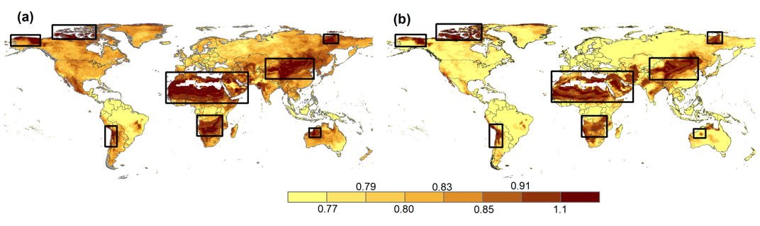 圖2. 1950-2014年全球的干旱瞬時(shí)發(fā)展速度(a)和瞬時(shí)恢復(fù)速度(b)的空間分布。黑框表示全球八個(gè)干旱發(fā)展和恢復(fù)速度較快的熱點(diǎn)區(qū)域。
