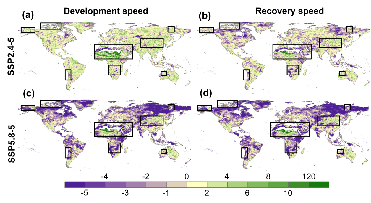 圖3. 與歷史多模型集成均值比較,SSP245和SSP585情景下干旱瞬時(shí)發(fā)展和恢復(fù)速度的相對(duì)變化(%)。正值表示干旱發(fā)展或恢復(fù)過程的加速,反之亦然。