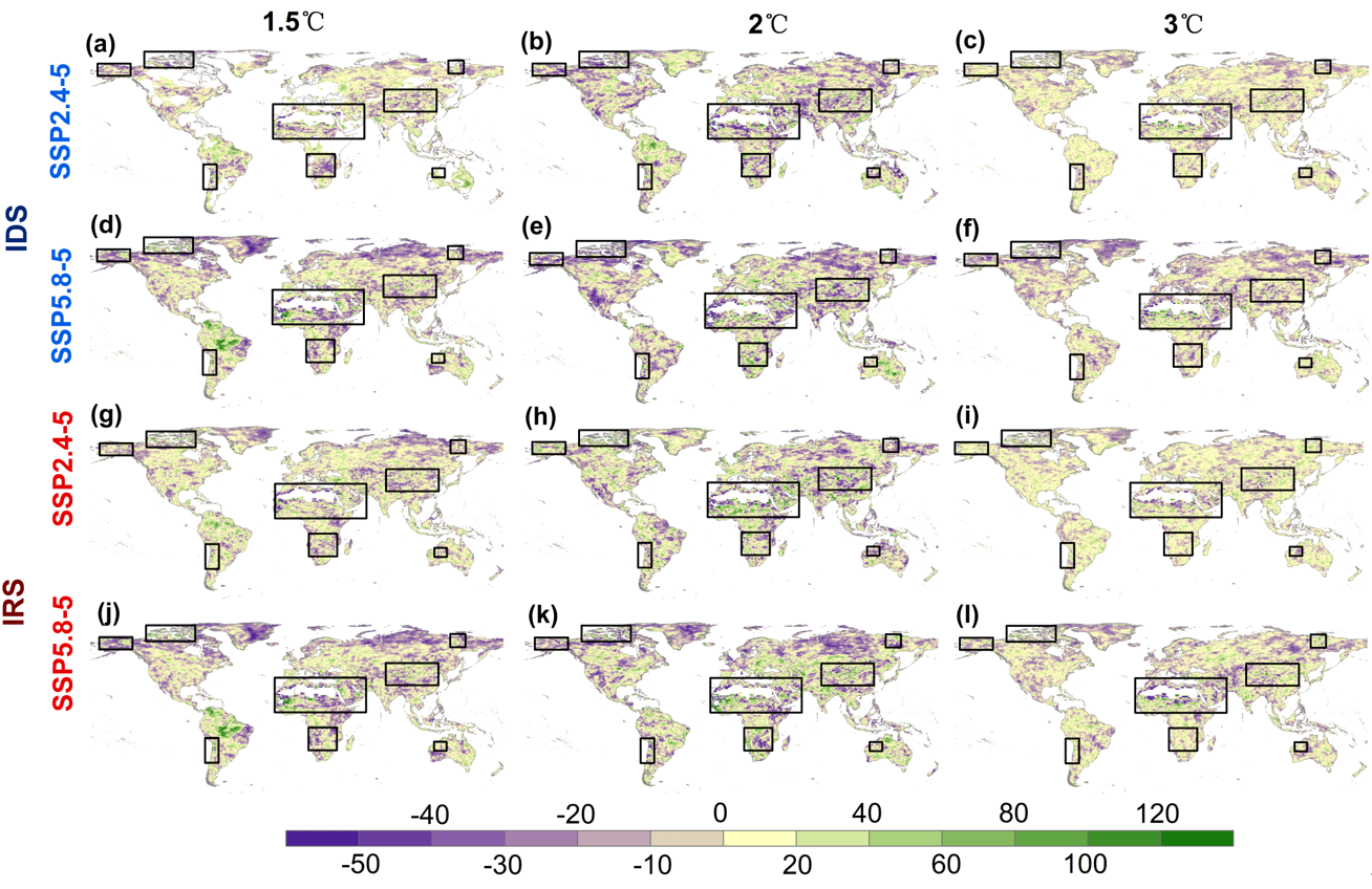 圖4. 與歷史多模型均值相比,SSP245和SSP585情景下不同升溫水平(1.5℃、2℃和3℃)下干旱瞬時(shí)發(fā)展速度(IDS)和瞬時(shí)恢復(fù)速度(IRS)的相對(duì)變化(%)。