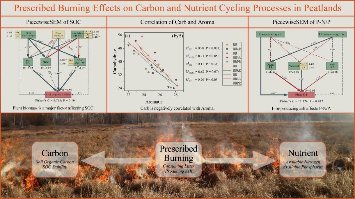 中國科學院東北地理所濕地演化與生態功能學科組與東北林業大學、吉林農業大學等高校合作,自2020年起在大興安嶺地區的林緣泥炭地進行長期計劃火燒模擬試驗(圖 1),探究計劃火燒影響下多年凍土區泥炭地土壤碳穩定性以及養分循環影響。研究發現,隨著計劃火燒次數的增加,泥炭土壤總碳含量逐漸下降,原因在于連續火燒導致游離顆粒有機物(fPOM)降低。土壤有機碳的結構方程模型表明,計劃火燒后植物生物量的增加直接影響了泥炭地的碳累積,而土壤含水率和pH通過影響土壤碳氮比和土壤有機碳穩定性間接影響了碳累積(圖2)。此外,計劃火燒導致泥炭地生態系統從氮限制向磷限制轉化,植物氮磷比的結構方程模型表明,火后產生的熱解碳是驅動氮限制向磷限制轉化的主要原因。