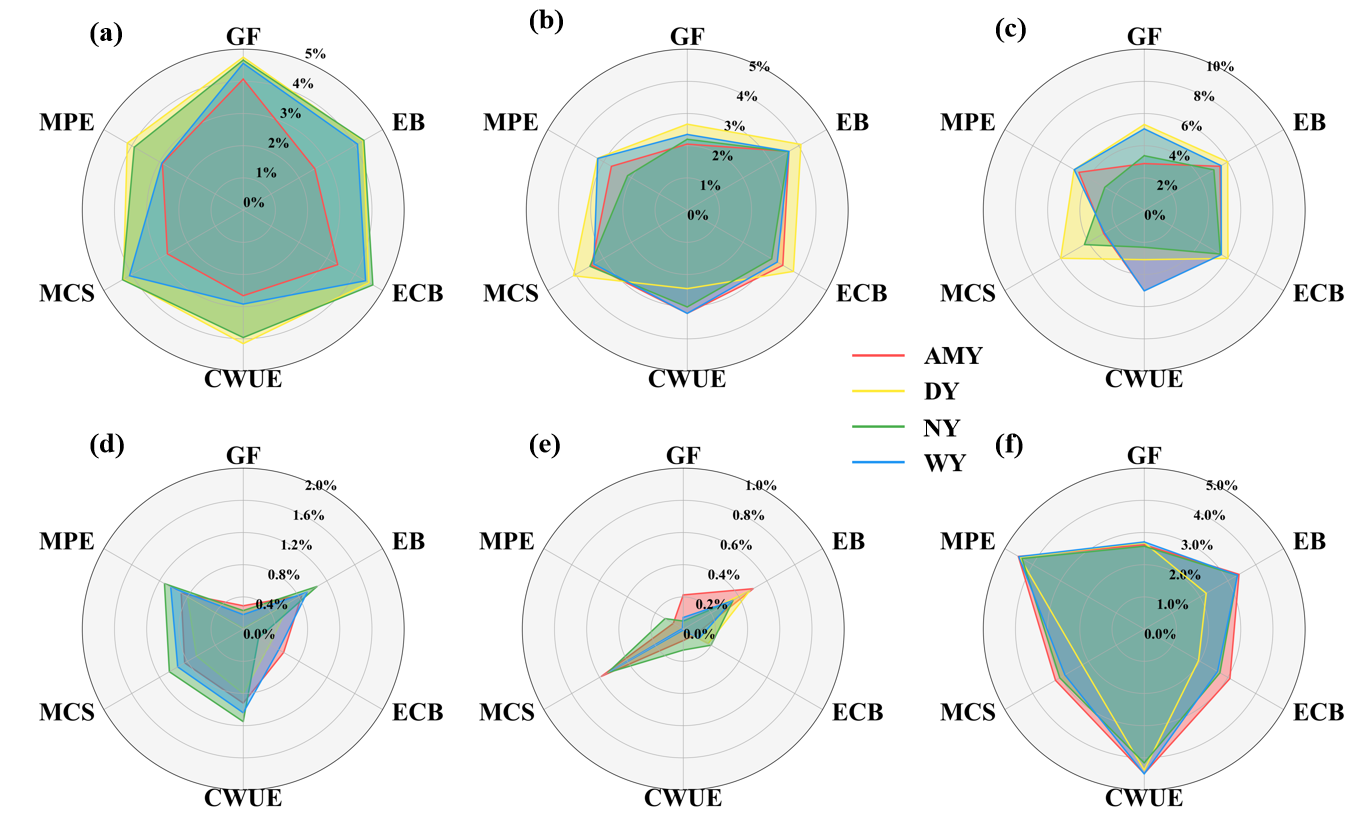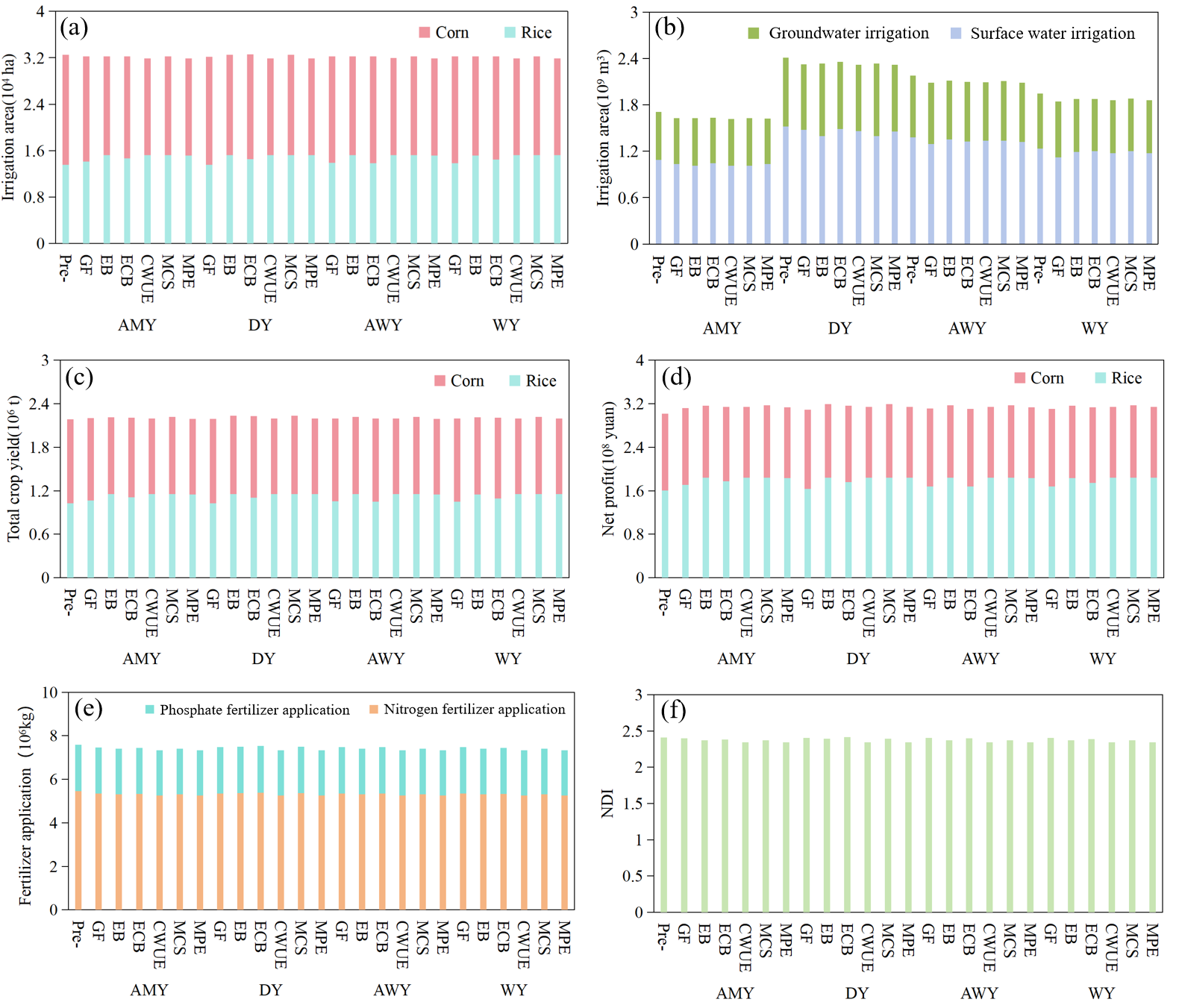 圖3 大安灌區(qū)的優(yōu)化配置結(jié)果 (a–d)年灌溉面積、灌溉水源、作物總產(chǎn)量和每種作物的凈利潤;(e)氮磷肥施用量;(f)NDI污染指數(shù)(側(cè)重地下水足跡(GF),側(cè)重經(jīng)濟(jì)效益(EB),側(cè)重生態(tài)效益(ECB),側(cè)重作物用水效率(CWUE),側(cè)重碳固存(MCS),側(cè)重污染物排放(MPE))。