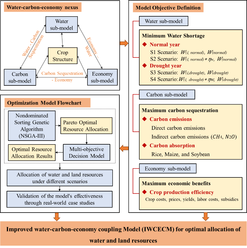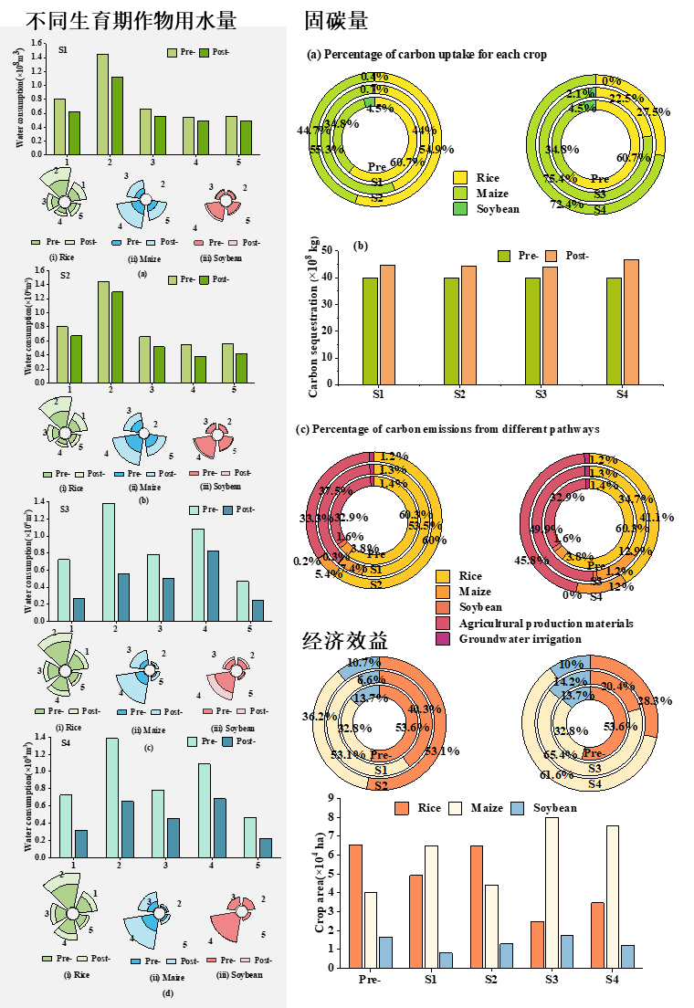 本研究突破了以往水資源分配中對作物需水過程過度概化的問題,并對我們之前研發的WCECM模型進行了改進。研究從作物灌溉用水、種植結構、固碳量、經濟效益和產量等多個角度進行了深入分析。基于作物需水過程,提出了不同水文情景下的作物種植結構和水資源優化配置方案。通過 NSGA-III 算法選擇最優解,并提出有針對性的優化策略。最后將改進的水-碳-經濟耦合模型(IWCECM)在中國具有代表性的農業主產區——三江平原友誼農場進行應用和驗證。結果表明,改進后的模型不僅能夠根據不同情景精確調整作物種植結構,管理每種作物在不同生長階段的灌溉用水需求,還能提高固碳量、經濟收入和糧食產量。具體而言,優化后,平水年常規灌溉模式 (S1) 和節水灌溉模式 (S2)以及干旱年份的常規灌溉模式 (S3) 和節水灌溉模式 (S4)下的種植面積比例分別為4:5:1、5:4:1、2:7:1和3:6:1。與優化前相比,四種方案的總固碳量分別增加了4.95×108 kg、4.56×108 kg、4.04×108 kg和6.84×108 kg,糧食總產量分別增加了1.72×108 kg、1.43×108 kg、0.69×108 kg和1.45×108 kg。除枯水年外,其他方案下的經濟效益與優化前無明顯差異。在平水年,作物在生長初期的總用水量最高;在枯水年,作物在生長中期的總用水量最高。該結果不僅對解決當前農業水資源和土地資源的相關挑戰具有現實意義,也為未來農業的可持續發展提供了參考和建議。