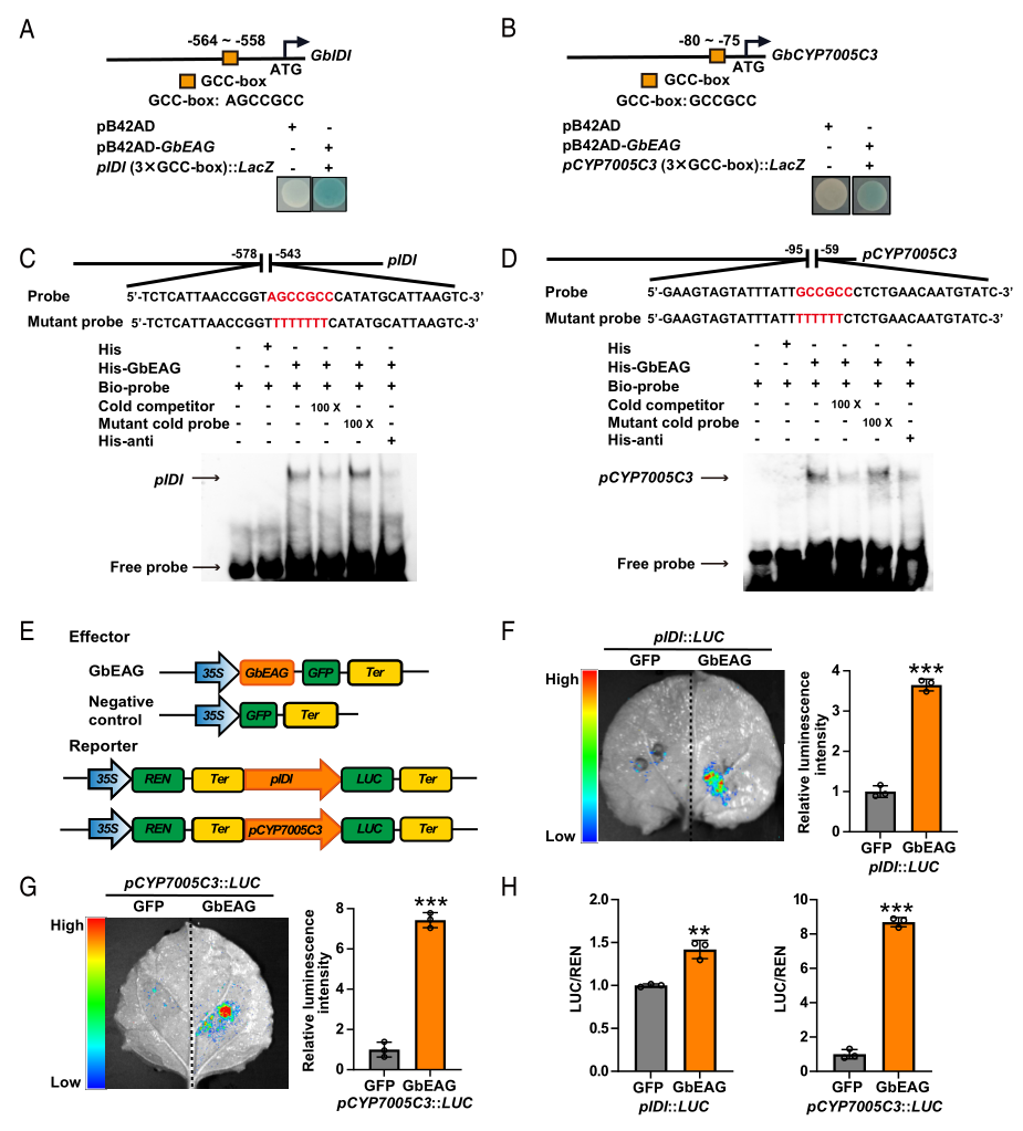 圖2. GbEAG通過直接結合GCC- box促進GbIDI和GbCYP7005C3的轉錄