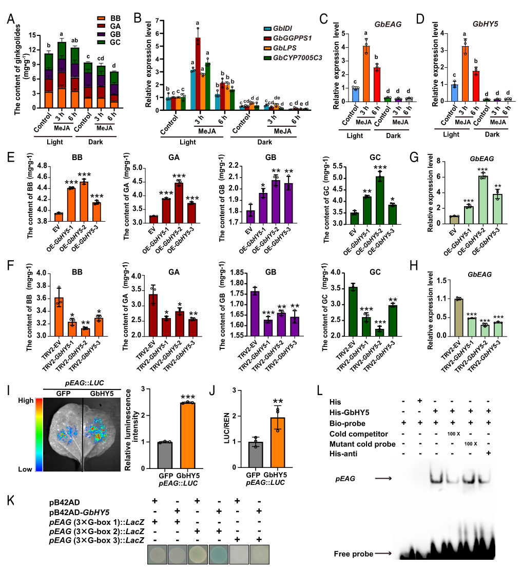 借助“切-浸-再生”系統,在銀杏根中過表達GbHY5,發現GbHY5過表達能上調銀杏內酯含量以及銀杏內酯合成途徑相關基因的表達量,同時增強GbEAG的轉錄表達。利用Y1H、Dual-LUC和EMSA實驗進一步驗證了GbHY5以結合至GbEAG啟動子上G-box基序的方式激活GbEAG的表達,從而正向調控銀杏內酯的生物合成。