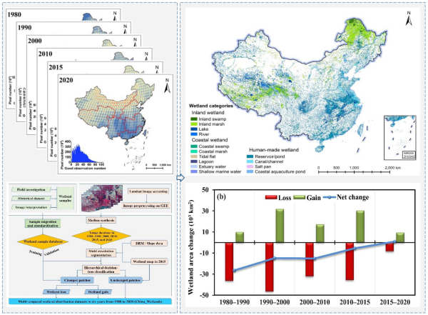 圖1 基于Landsat時間序列大數(shù)據(jù)的China_Wetlands數(shù)據(jù)集構(gòu)建及主要結(jié)果