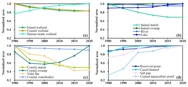 研究發(fā)現(xiàn):盡管濕地總面積變化相對較小,但不同類型濕地變化特征的時空異質(zhì)性明顯。中國自然濕地顯著減少,而人工濕地顯著增加。考慮到濕地類型和濕地生態(tài)系統(tǒng)功能與服務(wù)能力的差異,濕地的隱性損失應(yīng)得到廣泛關(guān)注。人工濕地的大面積增加約抵消了自然濕地的損失,抵消量為1.56萬km2;地表水體面積的增加量為1.40萬 km2,掩蓋了沼澤濕地(包括內(nèi)陸木本沼澤、內(nèi)陸草本沼澤、濱海木本沼澤、濱海草本沼澤)的劇烈損失特征。具有重要生態(tài)系統(tǒng)功能的草本沼澤仍呈現(xiàn)持續(xù)損失的趨勢,40年間凈損失了31%。