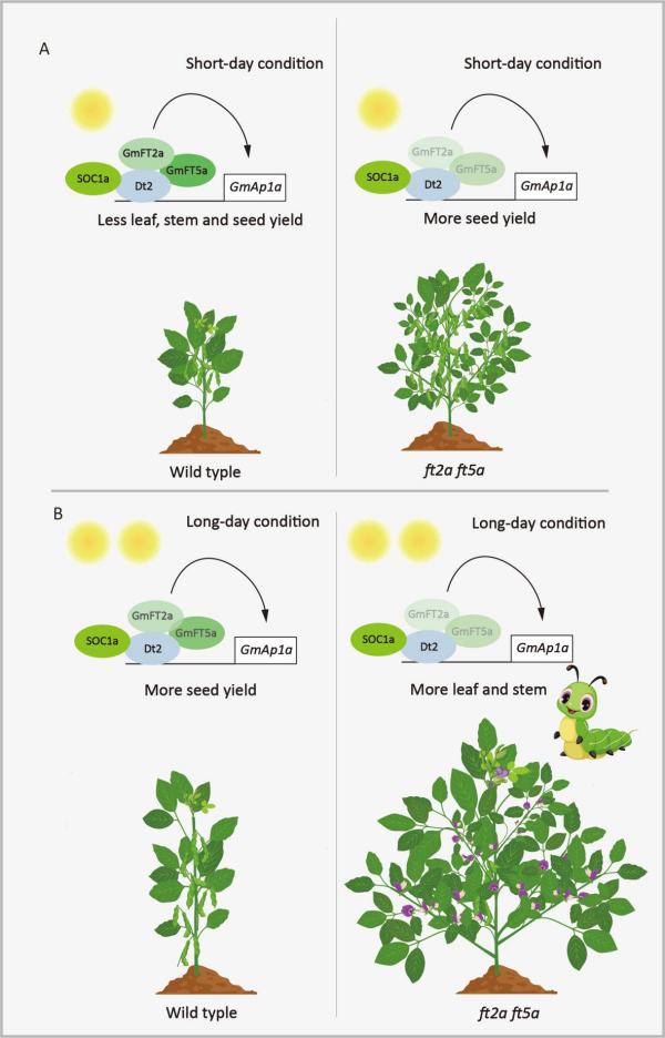 本研究通過編輯大豆中的開花素基因GmFT2a和GmFT5a,成功創(chuàng)制出兼具高產(chǎn)籽粒和高生物量的種質(zhì)。在短日照條件下,雙突變體表現(xiàn)出顯著的籽粒產(chǎn)量提升,主莖節(jié)數(shù)、分枝數(shù)和單株莢數(shù)顯著增加。在長日照條件下,雙突變體的總生物量顯著提高,表現(xiàn)為營養(yǎng)生長期延長、葉片增大、分枝和節(jié)數(shù)增加。雙突變體的可溶性蛋白和可溶性糖含量保持不變,而苯丙氨酸含量增加、單寧含量降低,可作為優(yōu)質(zhì)莖葉飼料。研究進(jìn)一步揭示了GmFT2a和GmFT5a調(diào)控大豆株型的分子機(jī)制。GmFT2a和GmFT5a蛋白不僅相互結(jié)合,還與大豆分枝和結(jié)莢習(xí)性關(guān)鍵基因Dt2和SOC1a相互作用,形成復(fù)合物,強(qiáng)烈激活下游基因GmAp1s的表達(dá),從而影響大豆的株型發(fā)育。該研究為培育適應(yīng)不同生產(chǎn)需求的大豆品種提供了理論依據(jù)和技術(shù)支撐,有助于提高大豆的市場(chǎng)競(jìng)爭力和經(jīng)濟(jì)價(jià)值。