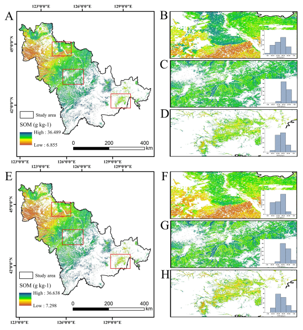 圖2. 吉林省土壤有機質(SOM)空間分布全局與局部回歸模型預測結果比較。A:全局回歸模型預測的SOM空間分布圖。B~D:A圖中選取的典型區(qū)域。E:局部回歸模型預測的SOM空間分布圖。F~H:E圖中選取的典型區(qū)域。B~D和F~H圖中的條形圖分別表示各區(qū)域內不同SOM含量的比例