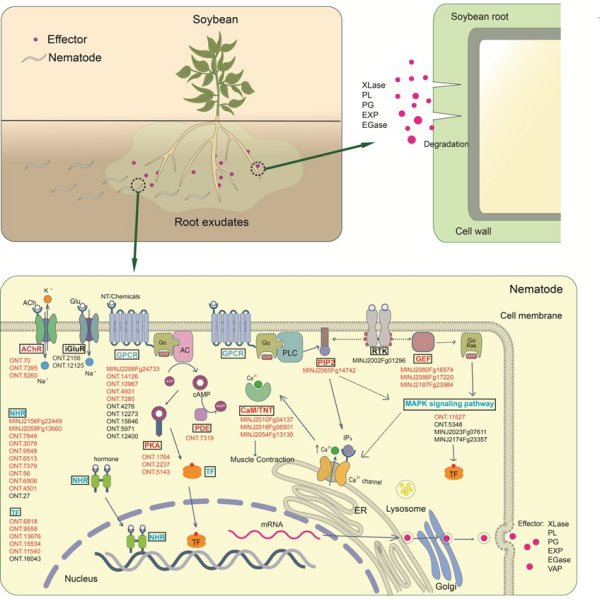 近日,東北地理所農(nóng)田有害生物控制學(xué)科組在多年研究積累的基礎(chǔ)上,從線蟲生態(tài)行為、信號轉(zhuǎn)導(dǎo)和代謝響應(yīng)等層面解析了線蟲聚集行為對寄主物種間的差異、分子調(diào)控機(jī)制及其生態(tài)學(xué)意義,為構(gòu)建線蟲病害綠色防控體系和推動根際微生態(tài)研究提供了新思路與技術(shù)途徑。研究以大豆和南方根結(jié)線蟲為研究對象,結(jié)合預(yù)寄生階段(處理5h)線蟲的轉(zhuǎn)錄組與植物根系分泌物的代謝組數(shù)據(jù),首次構(gòu)建了線蟲由感知植物信號到進(jìn)入“侵染準(zhǔn)備”狀態(tài)的分子響應(yīng)圖譜。共發(fā)現(xiàn)846個差異表達(dá)基因,其中GPCRs、NHRs、AChRs等趨化感知相關(guān)基因顯著上調(diào),表明線蟲已啟動預(yù)侵染程序。特別是59個候選效應(yīng)子中有58個在未侵入植物前上調(diào),涉及Pl、Exp、Xyl、Eng、Vap等關(guān)鍵效應(yīng)子,表明線蟲能僅靠根系信號提前激活寄生的機(jī)制。此外,線蟲在預(yù)寄生階段表現(xiàn)出代謝重編程,溶酶體功能基因上調(diào),解毒通路如P450和GST下調(diào),資源重新分配以支持寄生活動。同時,線蟲的行為也反向影響植物根系代謝物,說明雙方在早期即存在復(fù)雜的雙向調(diào)控機(jī)制(圖1)。研究成果發(fā)表在Phytopathology,并被評為第115期“Editor’s Picks”(圖3)。