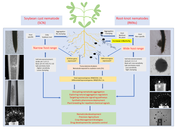 圖2 大豆孢囊線蟲和南方根結(jié)線蟲集聚行為的差異、與寄主范圍的關(guān)聯(lián)及生態(tài)學(xué)調(diào)控策略示意圖
