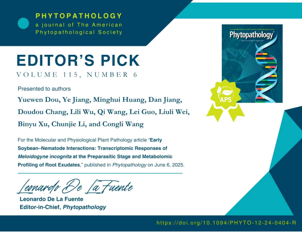 Yuewen Dou#,Ye Jiang#,Minghui Huang,Dan Jiang,Doudou Chang,Lili Wu,Qi Wang,Lei Guo,Liuli Wei,Binyu Xu,Chunjie Li*,and Congli Wang*. Early Soybean–Nematode Interactions: Transcriptomic Responses of Meloidogyne incognita at the Preparasitic Stage and Metabolomic Profiling of Root Exudates. Phytopathology,2025,115(6):701-717.