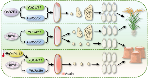 該研究首次發(fā)現(xiàn),OsBZR4是調控無胚水稻的關鍵基因,在不同栽培品種中突變該基因均可產(chǎn)生60%-100%的無胚種子。OsBZR4特異表達于盾片-胚乳界面。進一步發(fā)現(xiàn)OsBZR4抑制YUC4和PIN5b的表達,通過調控早期發(fā)育種子中生長素含量和分布來發(fā)揮作用。外源施加生長素或過量表達YUC4均能提高水稻無胚率,而施用生長素運輸抑制劑NPA則降低無胚率。此外,高溫環(huán)境會顯著增加bzr4突變株系的無胚率,發(fā)現(xiàn)高溫能誘導OsPIL13基因表達,OsPIL13促進YUC4的轉錄,進一步增加生長素含量,從而解析高溫增加無胚率的機制。有意義的是,將bzr4等位突變導入優(yōu)良水稻品種中嘉10和中嘉11,在不影響水稻產(chǎn)量前提下,可提高精米產(chǎn)量和耐儲性。