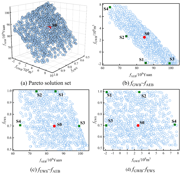 圖 2. 農(nóng)業(yè)系統(tǒng)經(jīng)濟(jì)效益(fAEB)、地下水均衡量(fGWB)和濕地生態(tài)需水量滿(mǎn)足度(fEWS)多目標(biāo)優(yōu)化結(jié)果帕累托三維展示(a)及投影(b-d)。S0是協(xié)調(diào)發(fā)展程度最大的解決方案;S1在與S0相同的fAEB處具有最高的fEWS;S2在與S0相同的fGWB下具有最高的fEWS;S3和S4在與S0相同的fEWS下分別具有最高的fAEB和最高的fGWB。