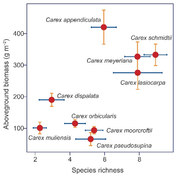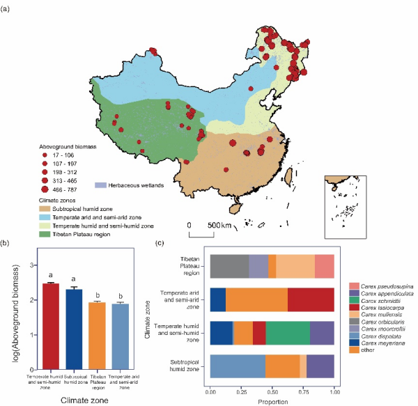 地上生物量是評估生態(tài)系統(tǒng)結(jié)構(gòu)與功能的關(guān)鍵指標。莎草類濕地(sedge wetlands)廣泛分布于全球溫帶沼澤和山地區(qū)域,具有固碳、維持生物多樣性和調(diào)節(jié)氣候等重要生態(tài)功能。然而,目前關(guān)于全國尺度莎草類濕地地上生物量分布格局及其影響機制尚不清楚。明確莎草類濕地地上生物量的空間分布及其生物和非生物影響機制,對預測濕地功能對未來環(huán)境變化的響應至關(guān)重要。