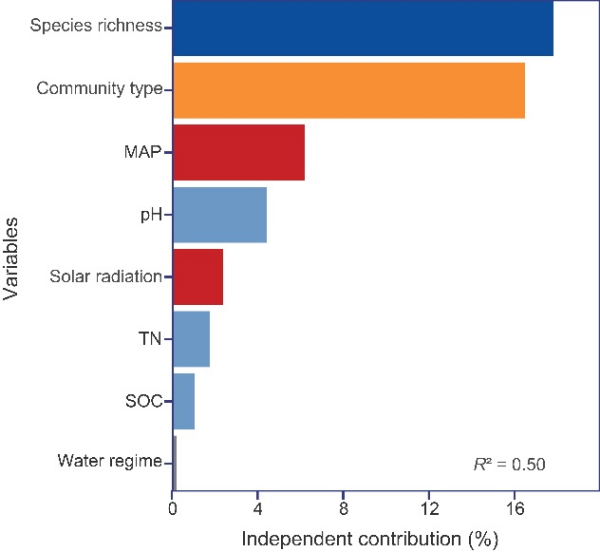東北地理所科研人員結(jié)合國家濕地資源調(diào)查數(shù)據(jù)與遙感獲取的氣候信息數(shù)據(jù),以我國125個典型莎草類濕地樣點為研究對象,明確了我國國家尺度濕地地上生物量的空間格局,分析了莎草類濕地植物物種豐富度與地上生物量的關(guān)系,揭示了生物和非生物因素對地上生物量的貢獻及影響機制。研究結(jié)果表明,中國不同氣候區(qū)莎草類濕地地上生物量具有顯著差異。非生物因子和生物因子共同影響莎草類濕地地上生物量。其中,生物因子在決定地上生物量分布格局中占主導地位。植物物種豐富度對地上生物量具有促進作用,而地上生物量與物種豐富度的關(guān)系受群落類型調(diào)控。此外,年平均降水量是影響莎草類濕地地上生物量空間分布的最主要非生物因子,二者呈正相關(guān)關(guān)系。土壤性質(zhì)不僅直接影響地上生物量,還通過物種豐富度和群落類型間接影響地上生物量。