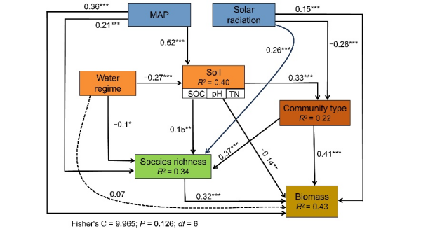 圖4 結(jié)構(gòu)方程模型揭示生物與非生物因子對中國莎草類濕地地上生物量的影響路徑