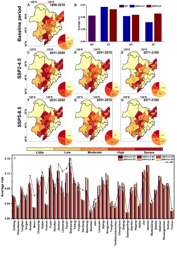 東北地理所水文與水資源學(xué)科組研究人員提出了一個(gè)綜合性的農(nóng)業(yè)水安全風(fēng)險(xiǎn)評(píng)估框架,系統(tǒng)整合了包括旱澇災(zāi)害時(shí)空特征(持續(xù)時(shí)間和強(qiáng)度)、區(qū)域氣候生產(chǎn)潛力、土地利用/覆被變化動(dòng)態(tài)以及主要糧食作物(水稻、玉米和大豆)對氣候變化的脆弱性響應(yīng)等多維度關(guān)鍵因子,構(gòu)建了適用于東北黑土區(qū)的農(nóng)業(yè)水安全風(fēng)險(xiǎn)評(píng)估框架?;谠摽蚣?,在柵格、地級(jí)市(40個(gè))和區(qū)域尺度(三大平原區(qū)與整個(gè)東北黑土區(qū))評(píng)估了基準(zhǔn)期(1999-2018年)農(nóng)業(yè)水安全災(zāi)害性、暴露度、脆弱性和風(fēng)險(xiǎn)格局;隨后,采用第六次國際耦合模式比較計(jì)劃(CMIP6)多模型集成數(shù)據(jù),模擬預(yù)測了SSP2-4.5(中等脅迫)和SSP5-8.5(高脅迫)兩種共享社會(huì)經(jīng)濟(jì)路徑下東北黑土區(qū)未來近期(2031-2050)、中期(2051-2070)和遠(yuǎn)期(2071-2100))農(nóng)業(yè)水安全災(zāi)害性、暴露度、脆弱性和風(fēng)險(xiǎn)格局的演變趨勢。