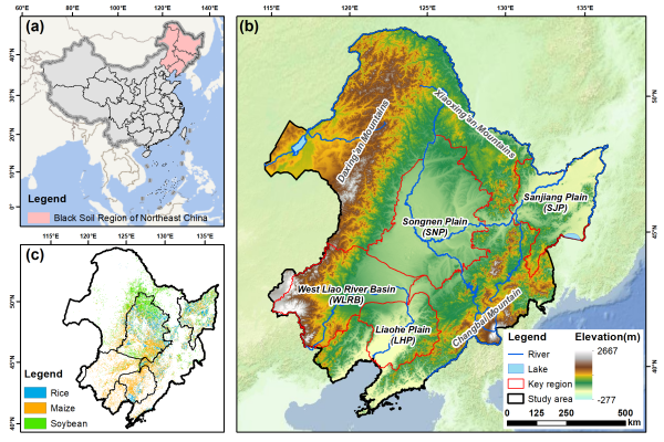 圖1 研究區(qū)及重點(diǎn)區(qū)域圖(a. 東北黑土區(qū)位置圖;b. 重點(diǎn)區(qū)域分布圖;c. 東北黑土區(qū)糧食種植分布圖)
