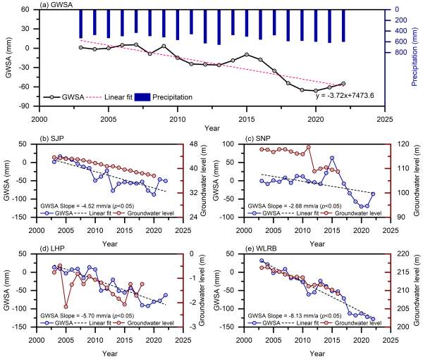 圖2 東北黑土區(qū)及重點(diǎn)區(qū)域地下水儲量(GWSA)年際變化趨勢圖(a.總體變化趨勢;b.三江平原;c.松嫩平原;d.遼河平原;e.西遼河流域)