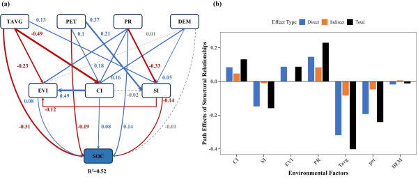 圖2東北地區(qū)關(guān)鍵環(huán)境因子驅(qū)動(dòng)SOC變化的級(jí)聯(lián)路徑與調(diào)控網(wǎng)絡(luò)