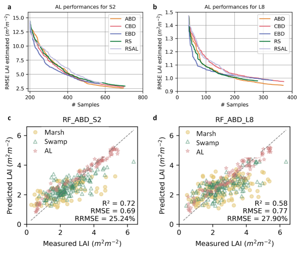 為解決上述科學(xué)問(wèn)題,中國(guó)科學(xué)院東北地理所濕地遙感研究團(tuán)隊(duì)基于多年野外原位數(shù)據(jù)積累與多源遙感數(shù)據(jù),率先構(gòu)建了一套面向全國(guó)尺度的濕地LAI混合反演與制圖方法框架,實(shí)現(xiàn)了我國(guó)國(guó)家尺度濕地植被生態(tài)參數(shù)、10 m空間分辨率的突破。該研究整合了2013–2023年期間我國(guó)不同濕地植被類型的865組野外實(shí)測(cè)LAI數(shù)據(jù),通過(guò)遙感云計(jì)算平臺(tái)融合多源衛(wèi)星影像(Sentinel-2與Landsat-8),創(chuàng)新性地提出一種“物理模型+主動(dòng)學(xué)習(xí)+機(jī)器學(xué)習(xí)回歸”的混合建模策略。通過(guò)經(jīng)典輻射傳輸模型(PROSAIL-5B)增強(qiáng)模型可解釋性,采用主動(dòng)學(xué)習(xí)技術(shù)優(yōu)化訓(xùn)練樣本分布,緩解病態(tài)反演和樣本冗余問(wèn)題,提高復(fù)雜濕地生物群系下的模型泛化能力,結(jié)合隨機(jī)森林機(jī)器學(xué)習(xí)算法建立高效穩(wěn)健的LAI反演模型。
