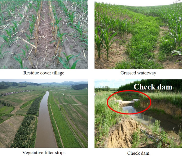 圖1 研究區BMPs應用情況。Residue cover tillage:秸稈覆蓋耕作;Grassed waterway:植草溝渠;Vegetative filter strips:植被過濾帶;Check dem:谷坊