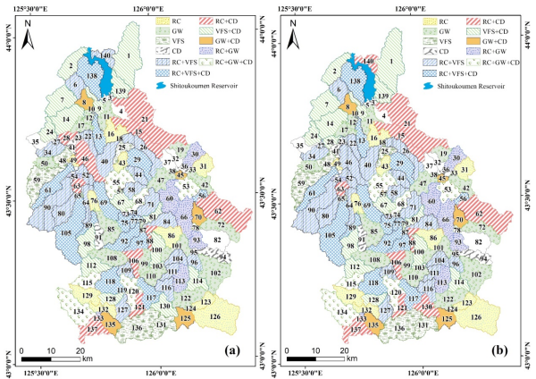 針對上述問題,中國科學院東北地理與農業生態研究所水環境污染與防治學科組以長春市重要飲用水源地—石頭口門水庫上游流域為研究對象,綜合運用土壤與水評估工具(SWAT)模型與非支配排序遺傳算法II(NSGA-II),開展了流域尺度上面源污染控制措施的多目標優化研究。研究評估了四種典型BMPs:秸稈覆蓋耕作(RC)、植草水道(GW)、植被過濾帶(VFS)和谷坊(CD)在不同組合情景下的污染負荷削減效能,并首次將實施成本、土地占用與污染削減效率納入統一優化框架。