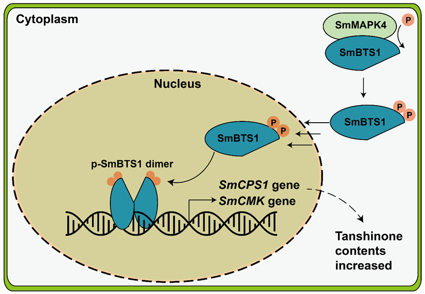 圖1. SmMAPK4-SmBTS1-SmCPS1促進丹參酮合成作用模式圖