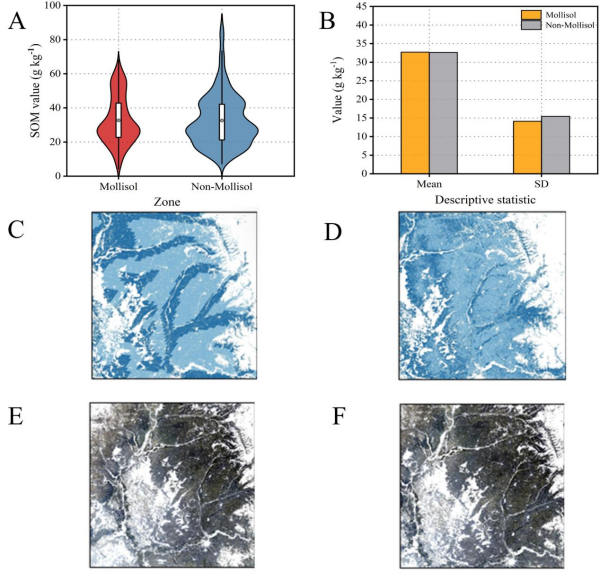 圖1 黑土與非黑土SOM含量差異。A、黑土與非黑土區(qū)域中土壤有機質(SOM)含量的濃度值;B、黑土與非黑土區(qū)域中土壤有機質含量的均值與標準差;C、基于糧農組織(FAO)分區(qū)結果的局部地圖;D、基于遙感分區(qū)結果的局部地圖。