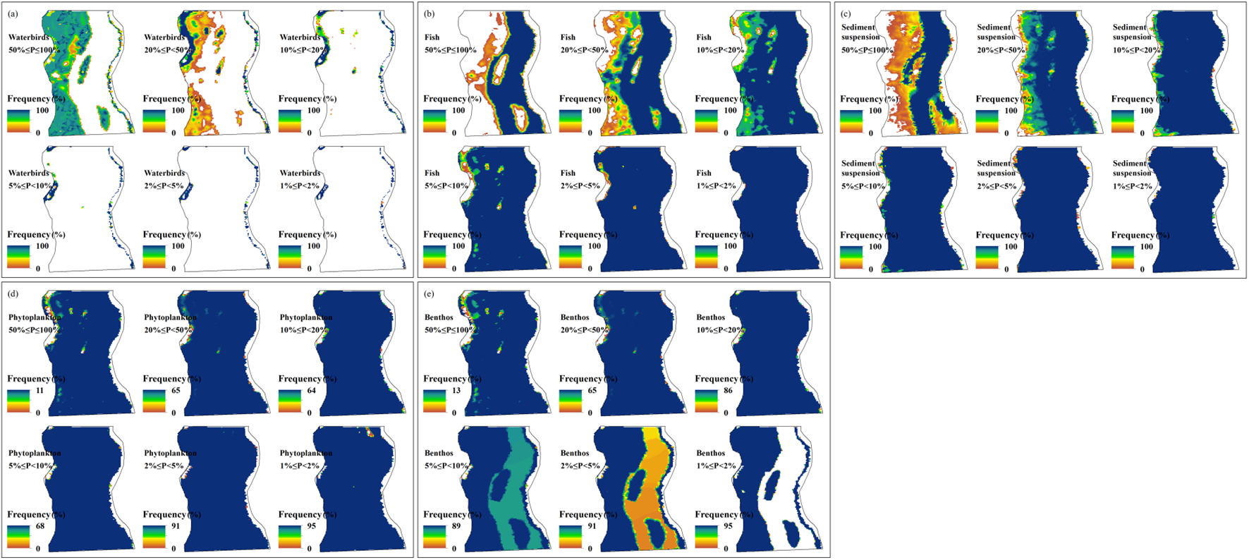 圖2 洪泛濕地潛在生境的空間分布 (a) 水鳥;(b) 魚類;(c) 泥沙懸浮物;(d) 浮游植物;(e) 底棲動(dòng)物(頻率是指某一區(qū)域適宜特定物種生存的天數(shù)占該特定洪水頻率發(fā)生總天數(shù)的比例)