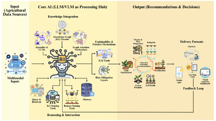 大語言模型與視覺-語言模型的協(xié)同融合,能夠實現對多模態(tài)數據的深度解析。視覺-語言模型融合圖像與文本編碼器,可聯(lián)合處理高分辨率作物影像與田間記錄,突破單視覺模型的泛化能力局限。同時,大語言模型憑借其在語義推理與少樣本學習方面的優(yōu)勢,可完成文獻挖掘、性狀描述與標注、診斷報告生成等任務。檢索增強生成技術(RAG)的融入,進一步提升了結果的可靠性,緩解了模型幻覺問題。