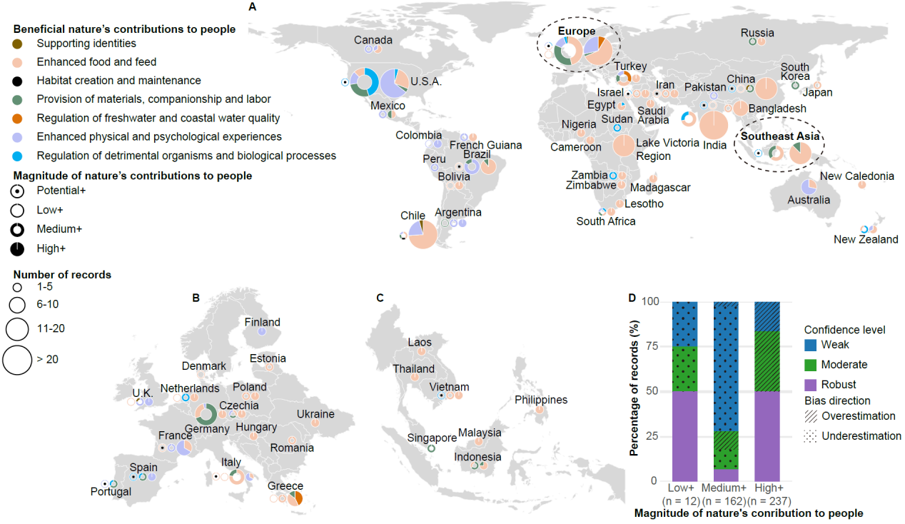 該研究基于“自然對人類貢獻(Nature’s Contributions to People)”框架開發(fā)了一套半定量評估方法,系統(tǒng)性評估了全球外來淡水大型動物對人類社會產(chǎn)生的正面與負(fù)面影響。研究結(jié)果表明,已有 93種外來淡水大型動物(占現(xiàn)存物種的43%)被引入到其本土分布區(qū)之外,涵蓋了魚類、哺乳類、爬行類和兩棲類。該研究共識別了429項正面社會經(jīng)濟效應(yīng)記錄(圖1),包括提升食物供給(57%)、促進休閑漁業(yè)和生態(tài)旅游(20%)以及提供生產(chǎn)和貿(mào)易所需的原材料供給(12%)等。一些淡水大型動物如鯉魚(Cyprinus carpio)、草魚(Ctenopharyngodon idella)和尖齒胡鯰?(Clarias gariepinus)等在全球多地被引入后已成為當(dāng)?shù)鼐用裰匾氖澄飦碓春蜐O業(yè)資源,而尼羅鱷(Crocodylus niloticus)和暹羅鱷等(Crocodylus siamensis)則常被引入到本土分布區(qū)之外用于發(fā)展養(yǎng)殖業(yè)和寵物貿(mào)易。研究還發(fā)現(xiàn),亞洲和非洲引入外來淡水大型動物的主要動機是增強食物供給,而在北美則主要與休閑漁業(yè)和寵物貿(mào)易相關(guān)。