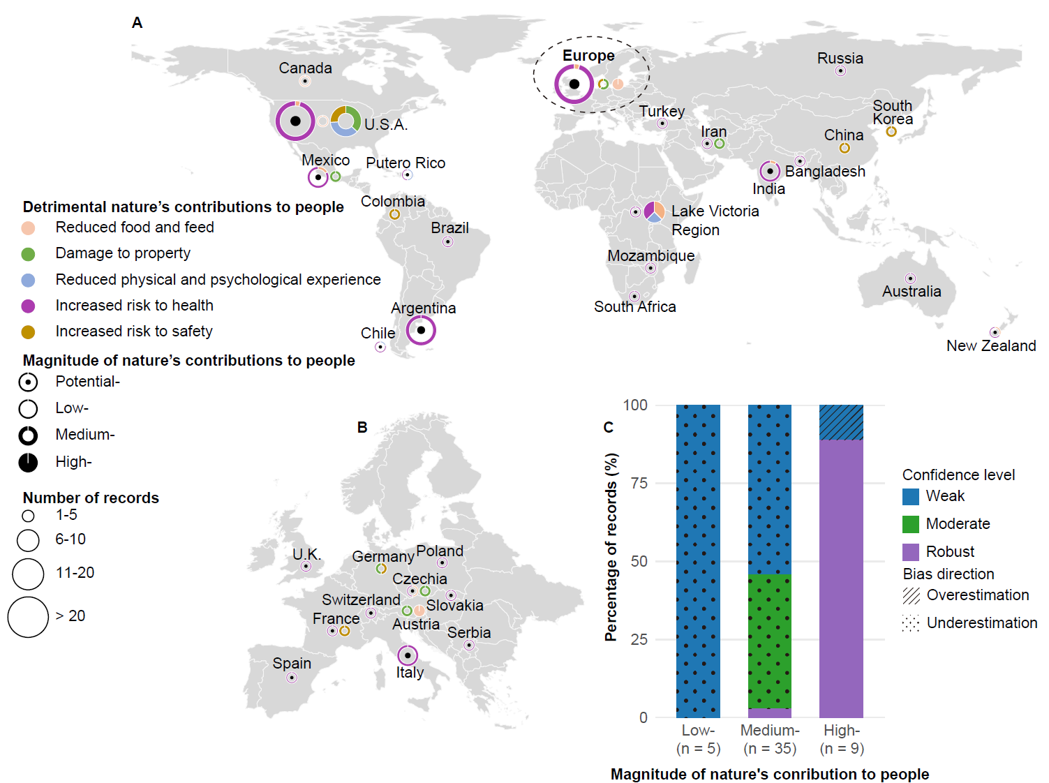 研究進一步指出,盡管外來淡水大型動物在引入地區(qū)帶來了可觀的經(jīng)濟收益,但其造成的負(fù)面社會經(jīng)濟影響不可忽視(圖2)。超過140項記錄表明外來淡水大型動物對人類健康(63%)、食物供給(10%)和財產(chǎn)設(shè)施(10%)等造成了損害。例如,河馬(Hippopotamus amphibius)被引入到哥倫比亞后由于缺乏天敵在當(dāng)?shù)匮杆俜敝常鋸姶蟮墓粜詫Ξ?dāng)?shù)鼐用竦娜松戆踩珮?gòu)成了直接威脅。尼羅河鱸(Lates niloticus )在維多利亞湖的引入雖然創(chuàng)造了明顯的經(jīng)濟收益,卻導(dǎo)致了當(dāng)?shù)乇就留~類資源迅速下降,進而威脅到低收入群體的食物供給并間接地促進了疾病的傳播。由于外來物種導(dǎo)致的一些影響如生計資本下降和疾病傳播等對當(dāng)?shù)厣鐣斐傻男?yīng)具有滯后性和隱蔽性,其負(fù)面社會經(jīng)濟效應(yīng)在一些地區(qū)可能被嚴(yán)重低估。