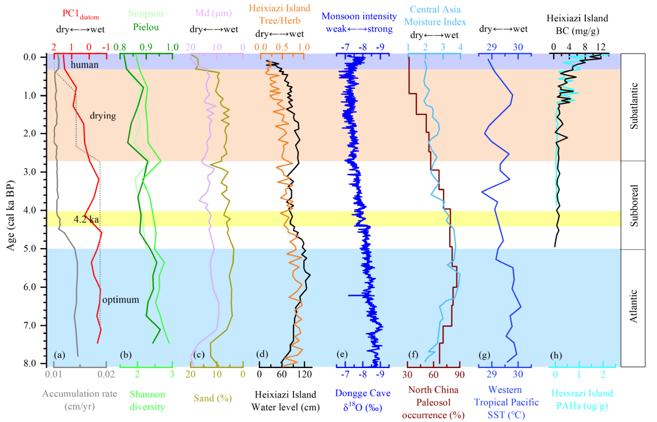 東北地理所大氣環(huán)境與生態(tài)演變學(xué)科組基于多指標(biāo)古生態(tài)學(xué)記錄,結(jié)合硅藻和粒度特征,重建了抓吉濕地歷史時(shí)期水位變化過(guò)程,探討中晚全新世三江平原濕地水文演化對(duì)EASM的響應(yīng)機(jī)制。研究結(jié)果表明:抓吉濕地的水位波動(dòng)在全新世中晚期與EASM強(qiáng)度緊密相關(guān)。由于硅藻對(duì)水文氣候變化的高度敏感性,其清晰地記錄了溫暖濕潤(rùn)的全新世氣候適宜期、中世紀(jì)暖期,以及寒冷干燥的4.2ka事件和小冰期等關(guān)鍵氣候事件。在大西洋時(shí)期,抓吉濕地的PC1diatom、粒度中值粒徑和砂含量均處于最低水平,表明當(dāng)時(shí)水位最高。受強(qiáng)EASM影響,氣候條件適宜,抓吉濕地的硅藻物種多樣性及沉積物累積速率均達(dá)到最高。在亞北方期,特別是亞大西洋時(shí)期,PC1diatom和粒度均表明由于EASM強(qiáng)度減弱,抓吉濕地水位持續(xù)下降。濕地干旱化顯著降低了沉積物累積速率和硅藻物種多樣性。值得注意的是,硅藻組合最顯著的變化是300年前干旱指示物種Hantzschia amphioxys和Pinnularia subcapitata突然增加,抓吉濕地的砂含量也達(dá)到峰值。近300年來(lái)人類(lèi)活動(dòng)的加劇導(dǎo)致抓吉濕地嚴(yán)重干旱,硅藻物種多樣性降至最低。三江平原的農(nóng)業(yè)活動(dòng)導(dǎo)致了土壤侵蝕,致使?jié)竦氐某练e速率有所增加。