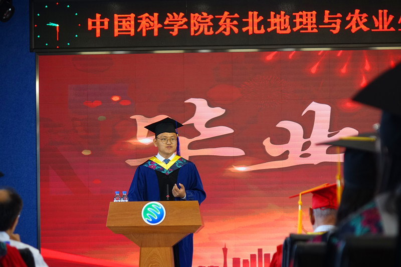 優(yōu)秀校友代表王野喬博士在畢業(yè)典禮上應邀致辭。王野喬博士是我所1987年碩士畢業(yè)生,教育部“長江學者”、美國青年科學家總統(tǒng)獎獲得者,美國羅德島大學終身教授。王野喬博士跟同學們一起重溫了千字文——蒙學教育的必修課。他說,地理學家是世界上最浪漫的工作者,他們探索地球奧秘,研究天地人之間的關系,并為建立和諧的人地關系而努力。他說,東北地理所是人杰地靈的地方,在這里的工作和學習,是他事業(yè)起步的開始。畢業(yè)典禮,是一座里程碑,更是另一段人生的開啟,同學們應該以此起步,走向更廣闊的明天!